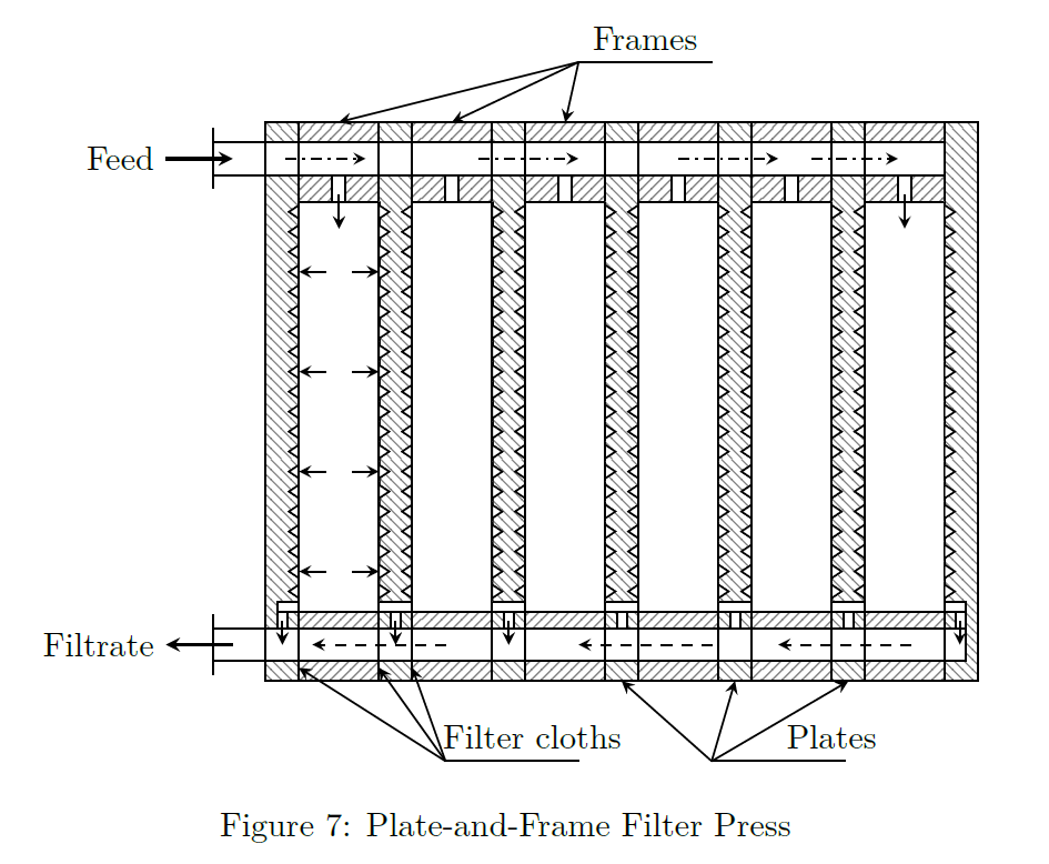 In the conventional plate-and-frame filter press, as shown in Fig.(7), a sequence of perforated square or rectangular plates alternating with hollow frames is mounted on suitable supports and pressed together with hydraulic or screw driven rams. The plates are covered with a filter cloth and the cloth also forms the sealing gasket. The slurry is pumped into the frames and the filtrate is drained from the plates. The plate surfaces are usually made in the form of raised cylinders, square-shaped pyramids or parallel grooves.