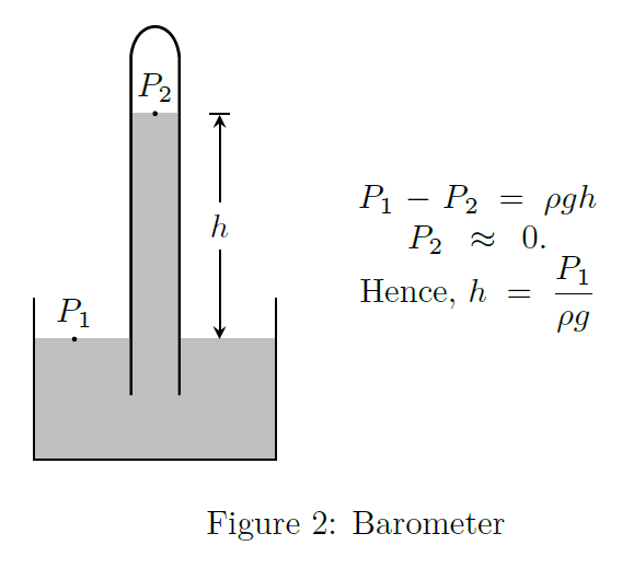 Barometer is an instrument to measure atmospheric pressure. It consists of an evacuated and graduated glass tube (mercury barometer), as shown in Fig.(2) in which a column of mercury rises or falls as the pressure of the atmosphere increases or decreases.